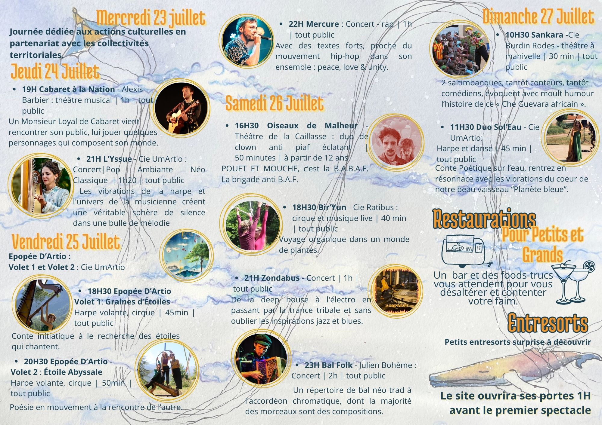 Du 24 au 27 juillet, venez découvrir la programmation du festival itinérant Chapi Volant à Keravel. Spectacles et concerts vous attendent sous notre beau chapiteau étoilé.