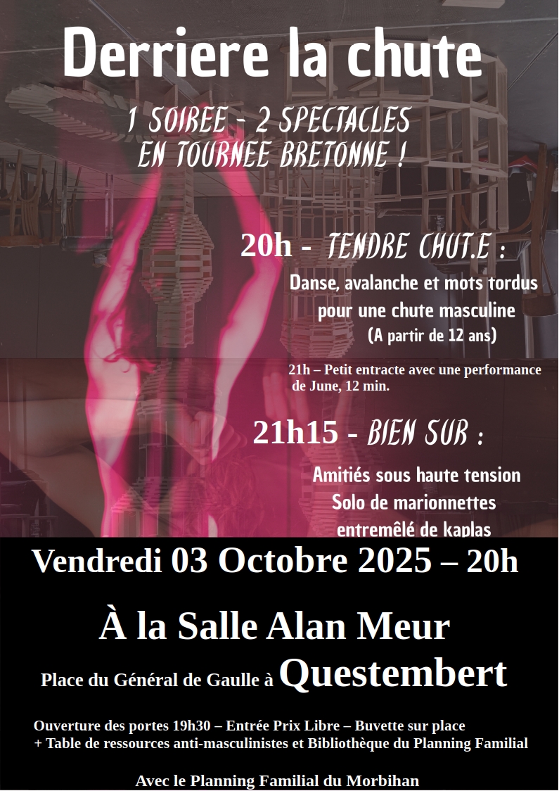 Voila une soirée avec deux spectacles qui parlent de genre, de codes sociaux, de chute, de mort, de virilité, de risque, d’absurde, d’amitié... On utilise la danse, la marionnette, les kaplas ( beaucoup) , la blague, la poesie, l’érotisme... C’est un plaisir de vous ouvrir nos petits mondes qui chutent.