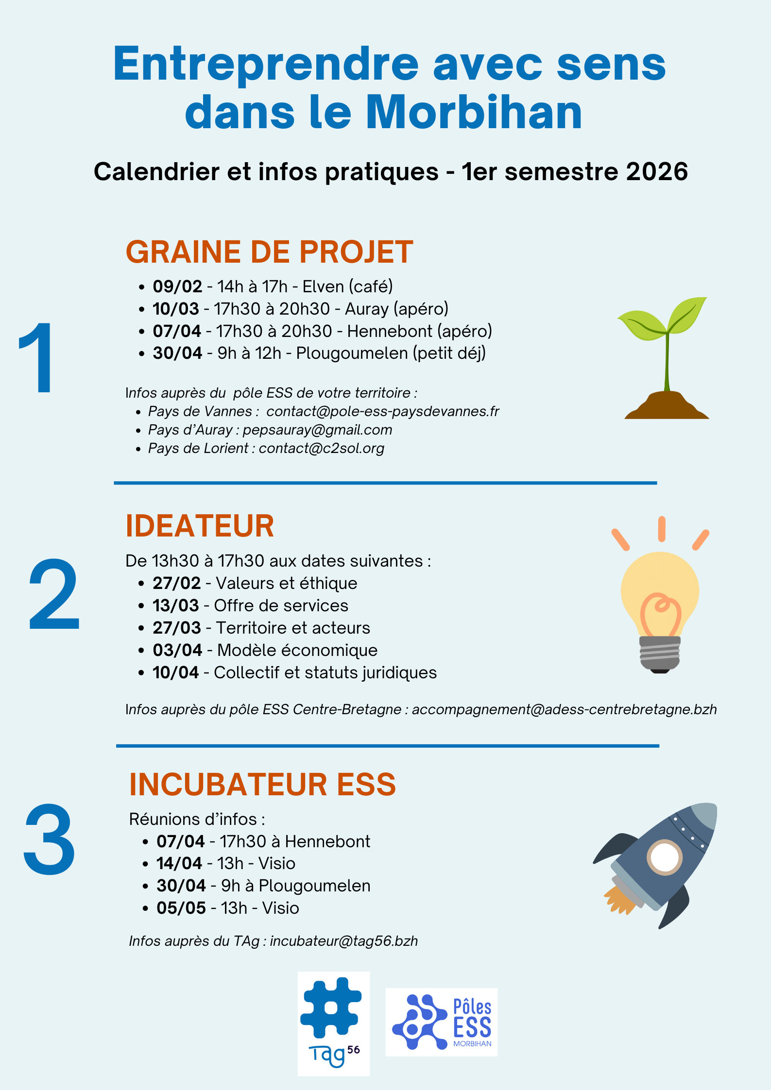 Les pôles de l’économie sociale et solidaire du Morbihan et le TAg56 ont le plaisir de vous partager le calendrier “Entreprendre avec sens dans le Morbihan – 1er semestre 2026”, qui présente l’offre d’accompagnement à destination des porteurs de projets de l’ESS, de l’idée à la création d’entreprise.