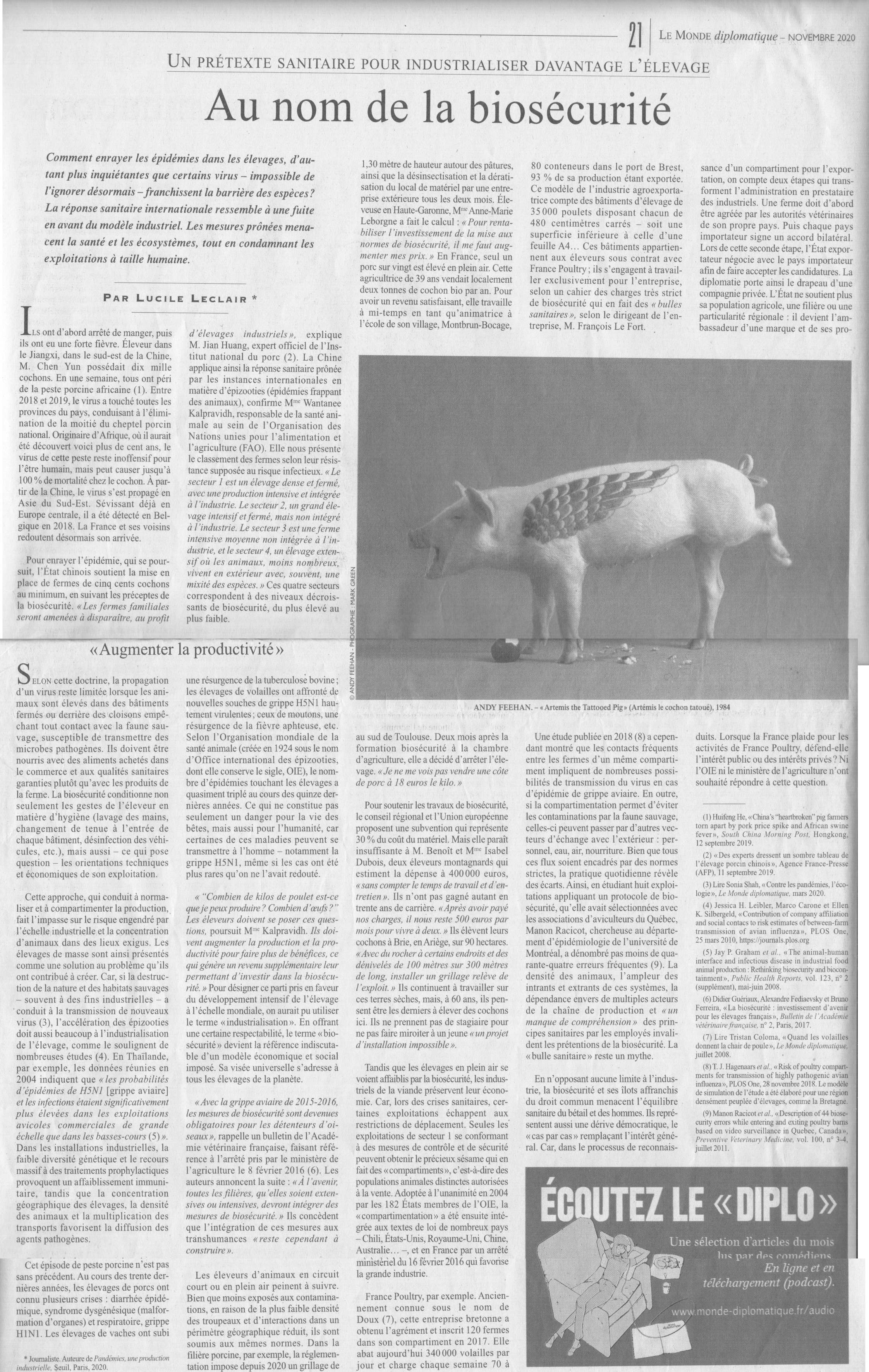 Article à lire : "Un prétexte sanitaire pour industrialiser davantage l’élevage" au nom de la biosécurité