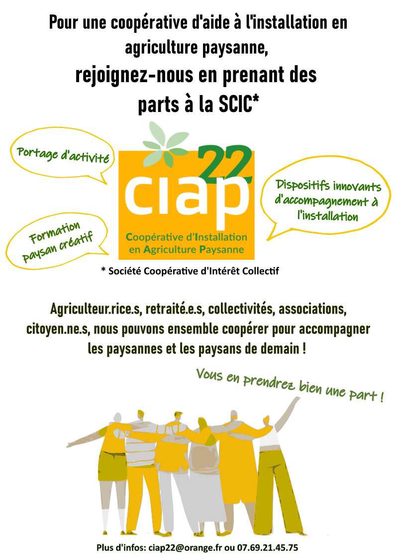 Pour rappel, la CIAP 22 devient une société coopérative pour développer le portage d’activité, un formidable outil pour faciliter l’installation. Chacun.e peut prendre des parts à la SCIC et ainsi participer à cette belle aventure. Vous trouverez en pièce-jointe les projets de statuts.