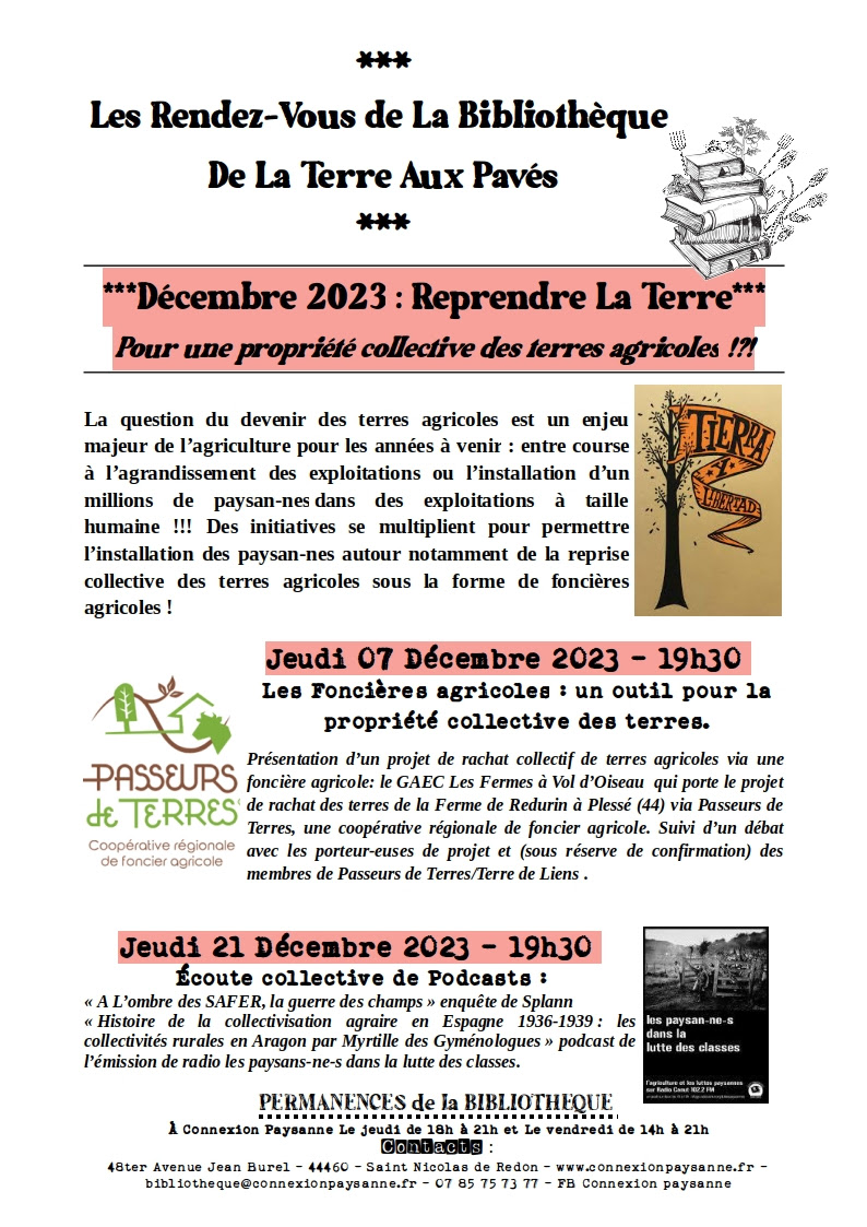 Fw : Les Rendez-Vous de la Bibliothèque de la Terre aux Pavés - Décembre 2023 : Reprendre la Terre : pour une propriété collective de la terre agricole