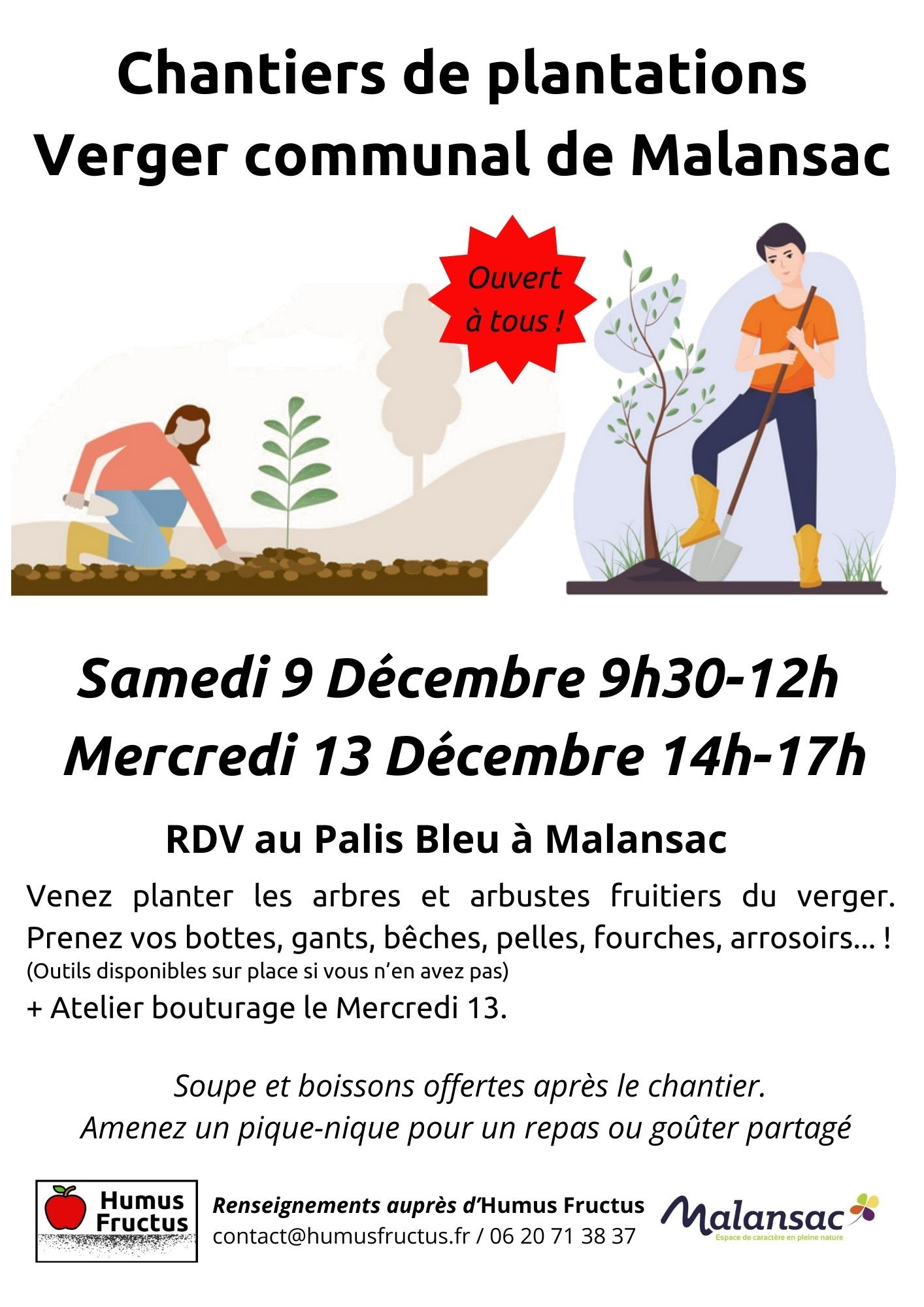 La commune de Malansac (accompagnée par Humus Fructus) vous invite à 2 chantiers participatifs de plantations d’arbres et arbustes fruitiers qui auront lieu les Samedi 9 Décembre matin et Mercredi 13 Décembre après-midi.