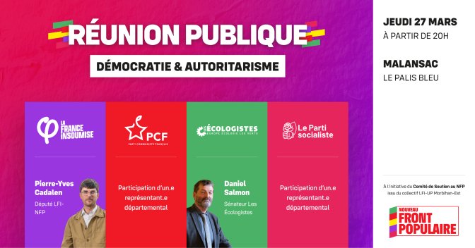 Une Réunion publique est organisée le jeudi 27 mars 2025 à 20h00 à Malansac, Le Palis Bleu Rue du Stade, dans le cadre du Nouveau Front Populaire sur le thème :