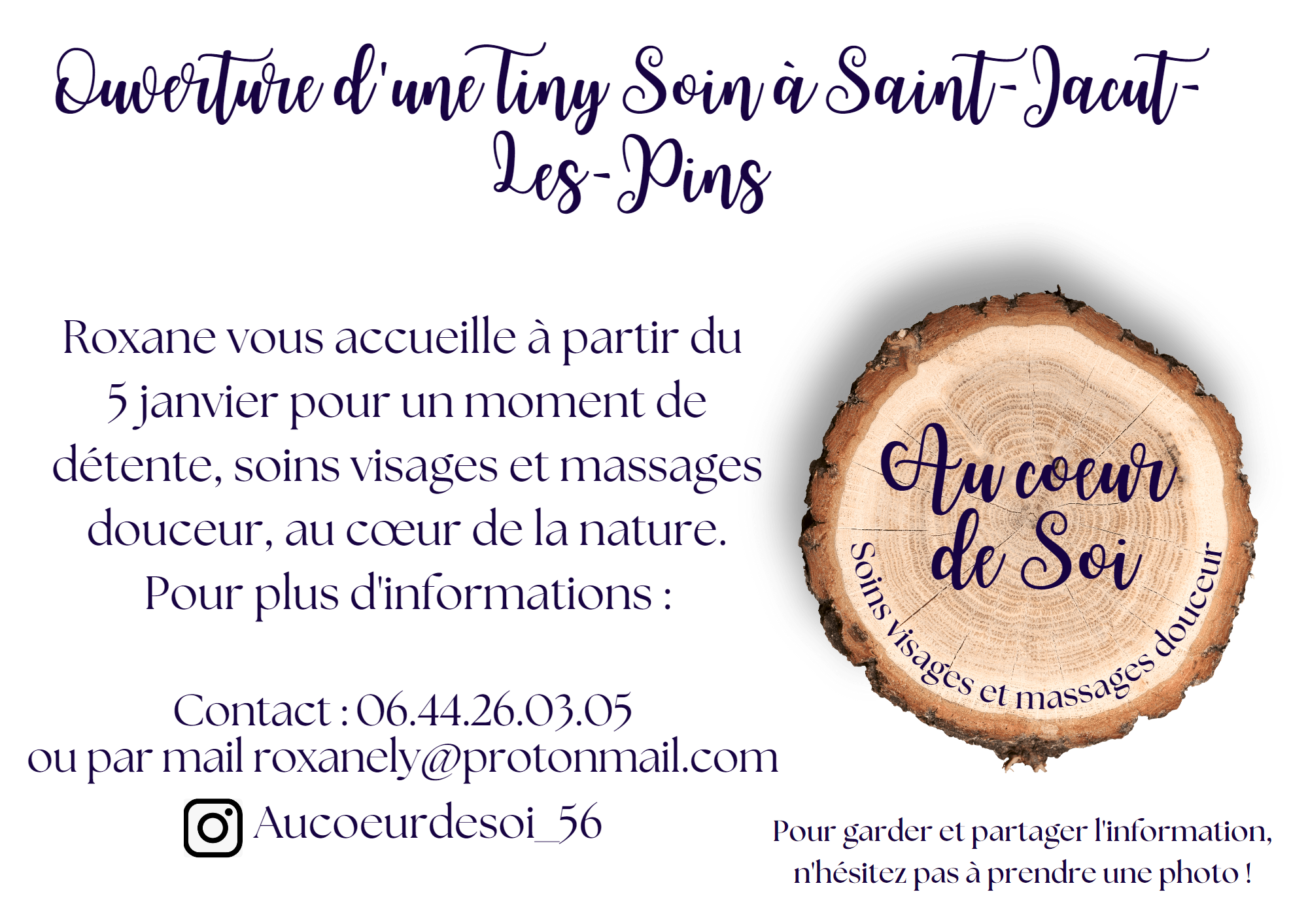 Le 10 décembre de 15h à 19h, je serai présente pour vous présenter mes soins (massages détente, soins du visage...) lors de l’ouverture exceptionnelle de la boutique d’Avelenn. Ce sera l’occasion de bénéficier d’une offre sur mes soins, et d’offrir des bons cadeaux.