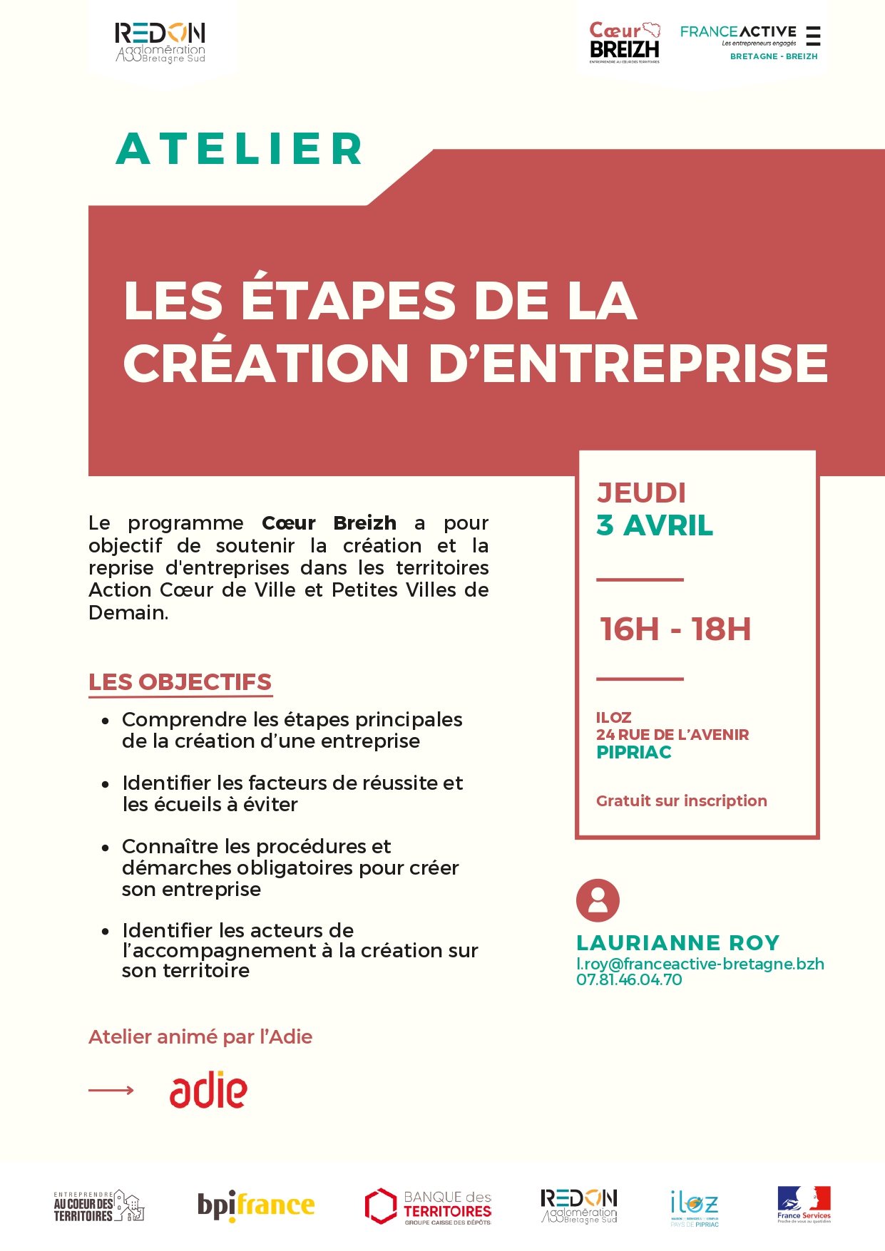 Le premier atelier collectif portera sur "les étapes de la création d’entreprise" et aura lieu le jeudi 3 avril à Pipriac. Il sera animé par l’Adie.