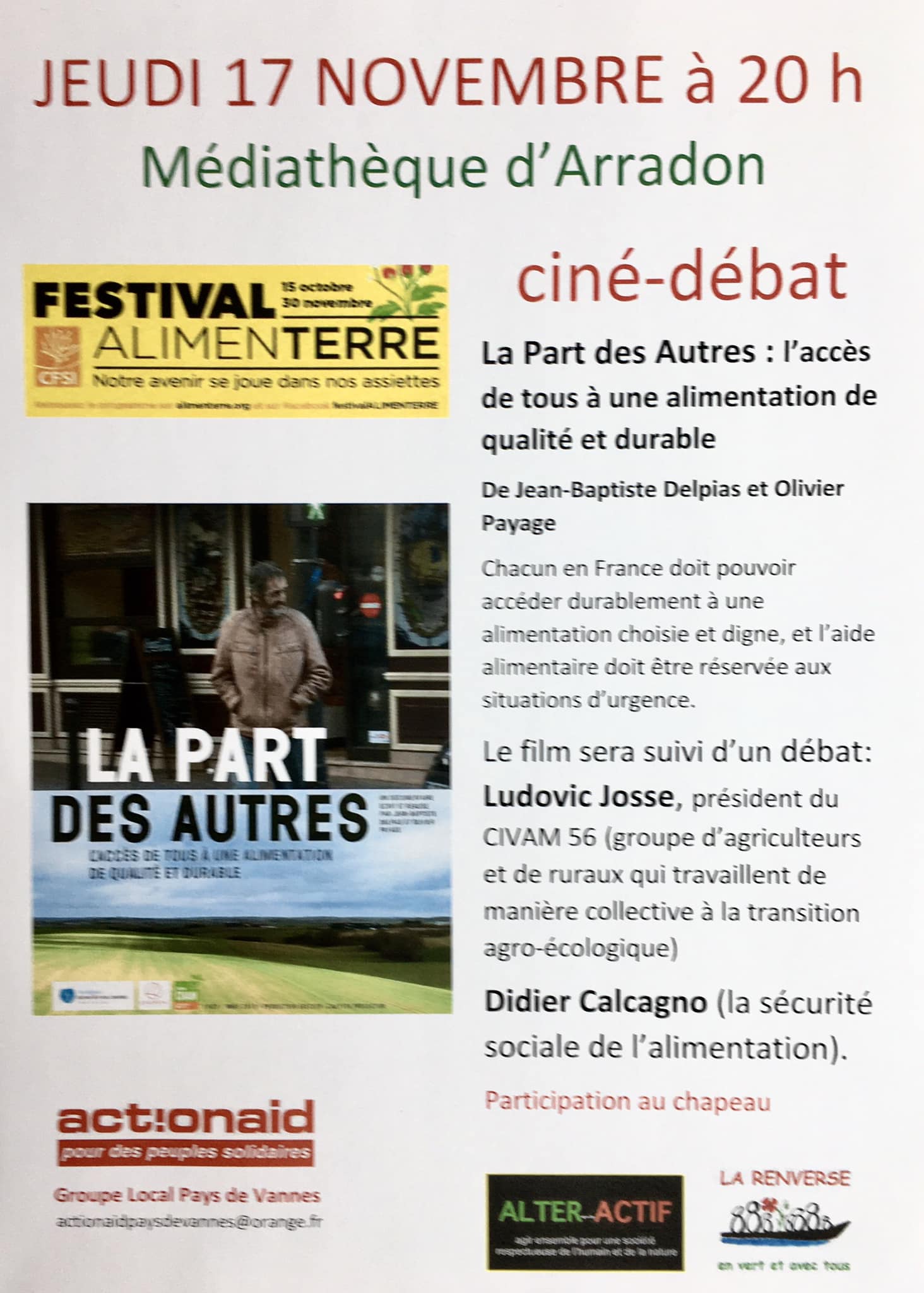 Dans le cadre du Festival Alimenterre, l’association arradonaise "Alter-Actif" et l’association L’Elfe : (l’Épicerie Solidaire en Brocéliande ) organisent la projection du film "La Part des Autres" dédié à l’accès pour tous-tes à une alimentation durable et de qualité.