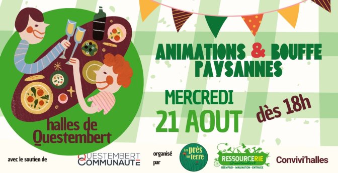 Les Prés sur Terre, la Cantine de la Ressourcerie de Questembert et l’association Convivi’halles s’associent pour une soirée concert + bouffe + animations paysannes le mercredi 21 août prochain sous les halles de Questembert !