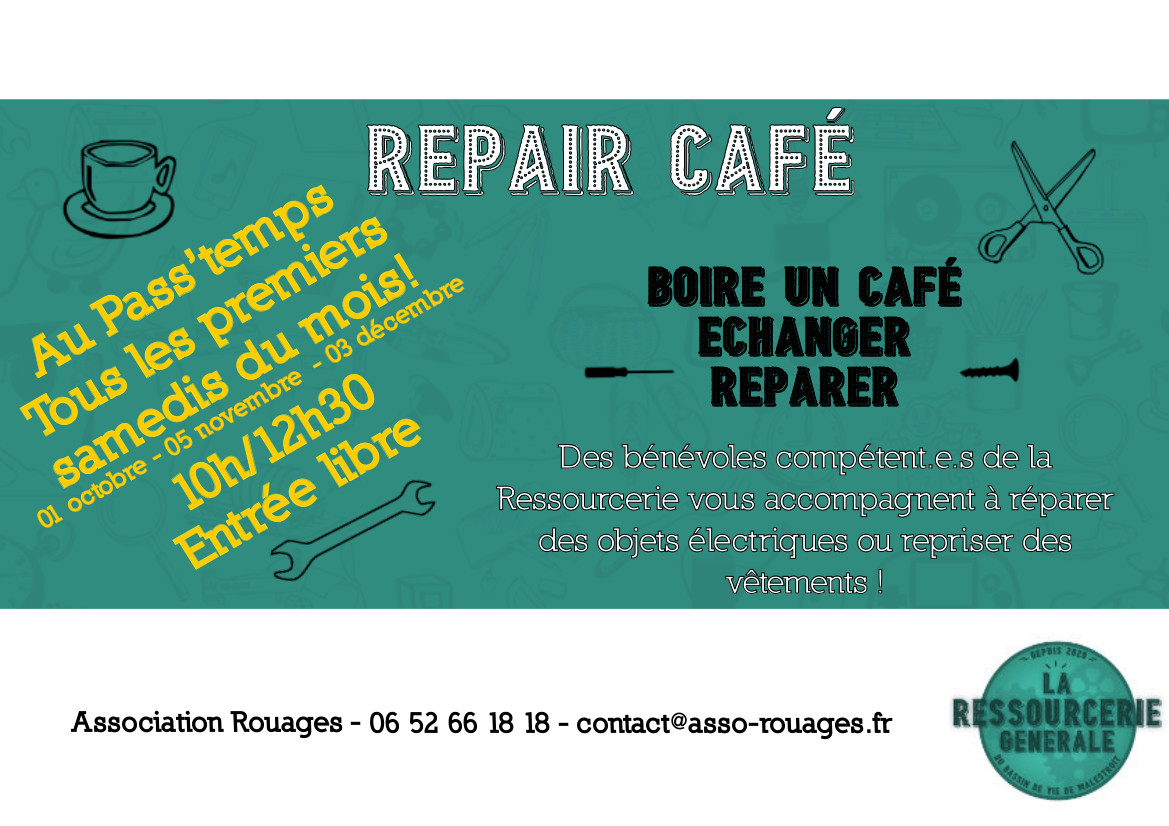Rendez-vous ce samedi 1er octobre de 10h00 à 12h30 au Pass’temps. Gratuit. Infos auprès de la Ressourcerie au 06 52 66 18 18 ou à l’adresse contact@asso-rouages.fr