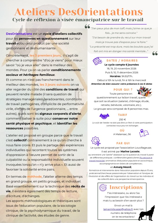 DesOrientations est un cycle d’ateliers collectifs pour les personnes en questionnement sur leur travail et/ou celui produit par une société gestionnaire et déshumanisante.