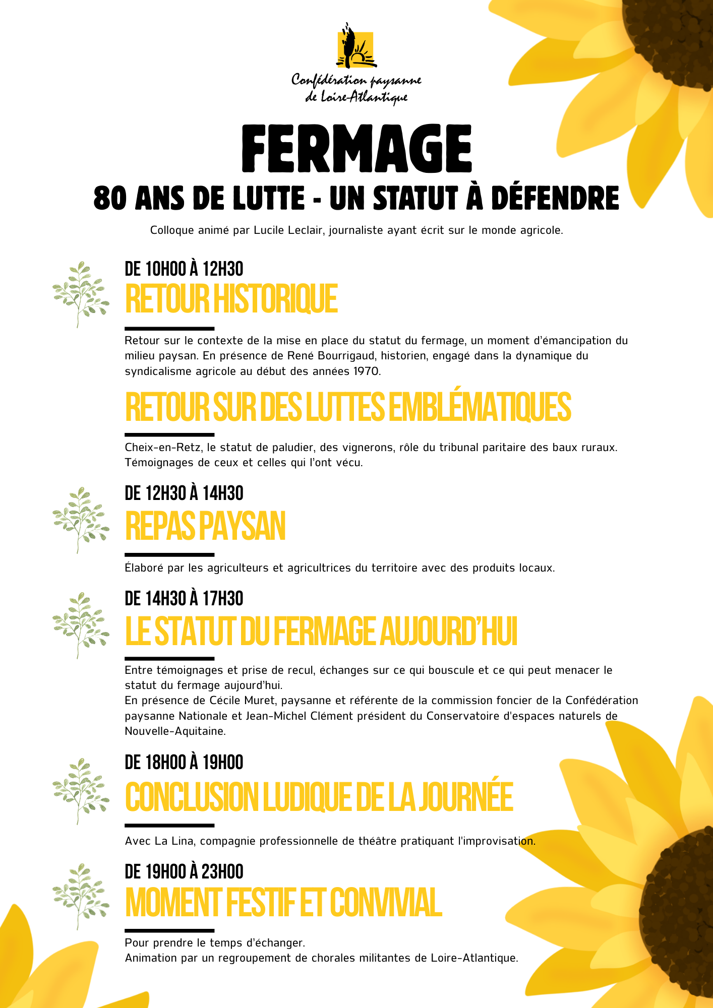 La Confédération paysanne de Loire-Atlantique a le plaisir de vous inviter à participer au colloque sur le statut du fermage le samedi 11 avril prochain à Grandchamp-des-Fontaines, en Loire-Atlantique (44).