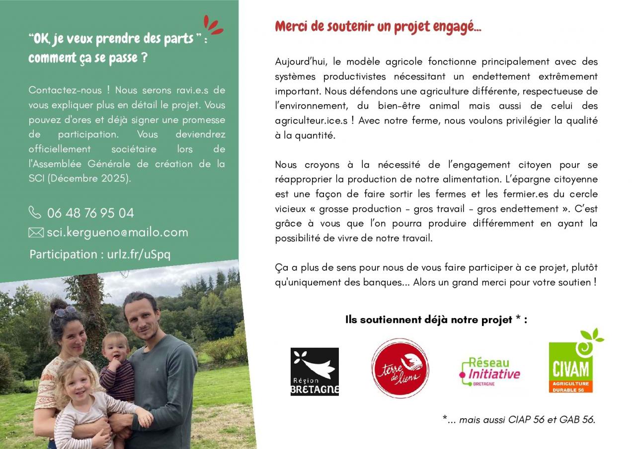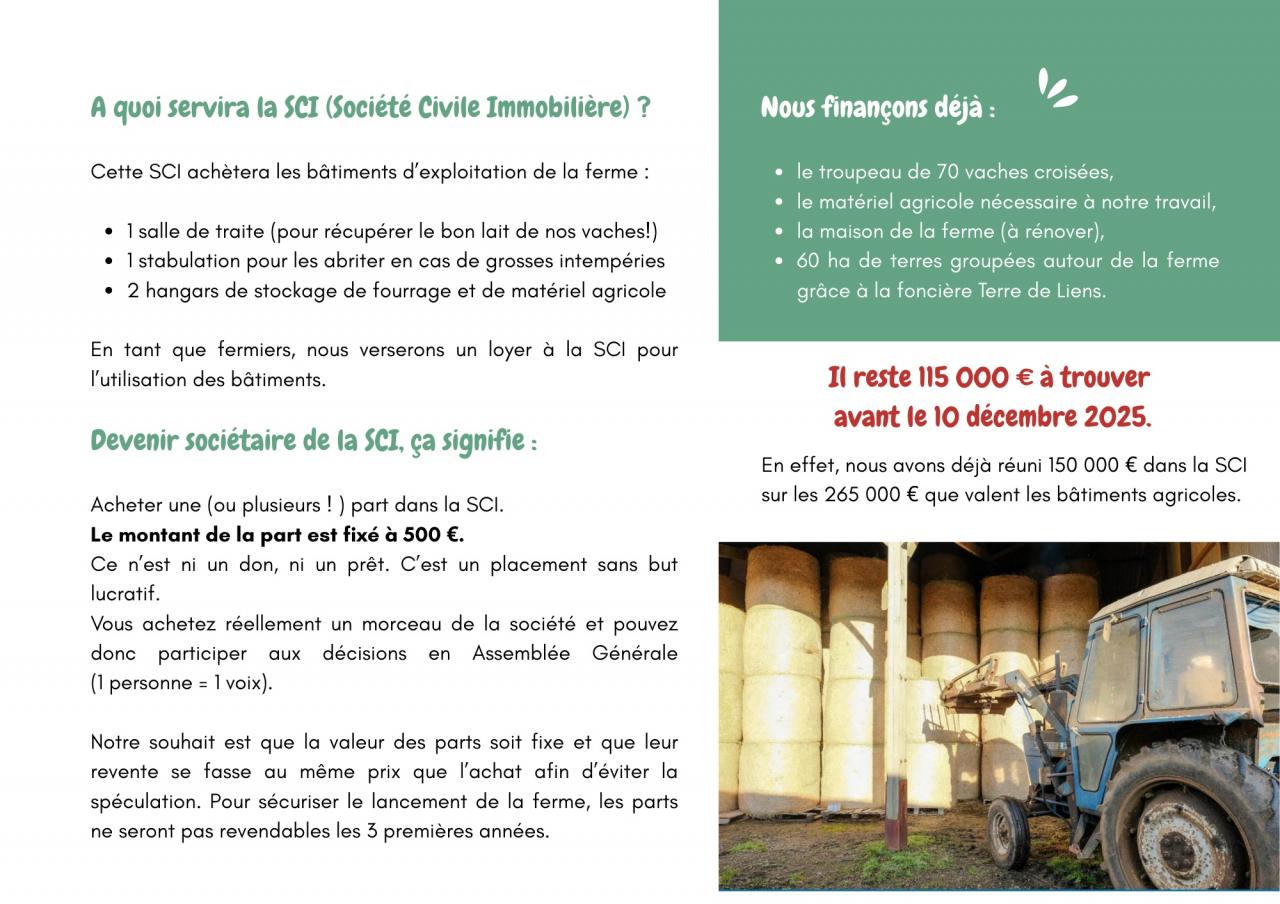 Pour permettre à de jeunes paysan.ne.s de s’installer, la participation citoyenne (c’est vous !) est un levier important. Concrètement, nous vous proposons de nous soutenir en prenant des parts dans une SCI (société civile immobilière) qui rachètera les bâtiments de la ferme !