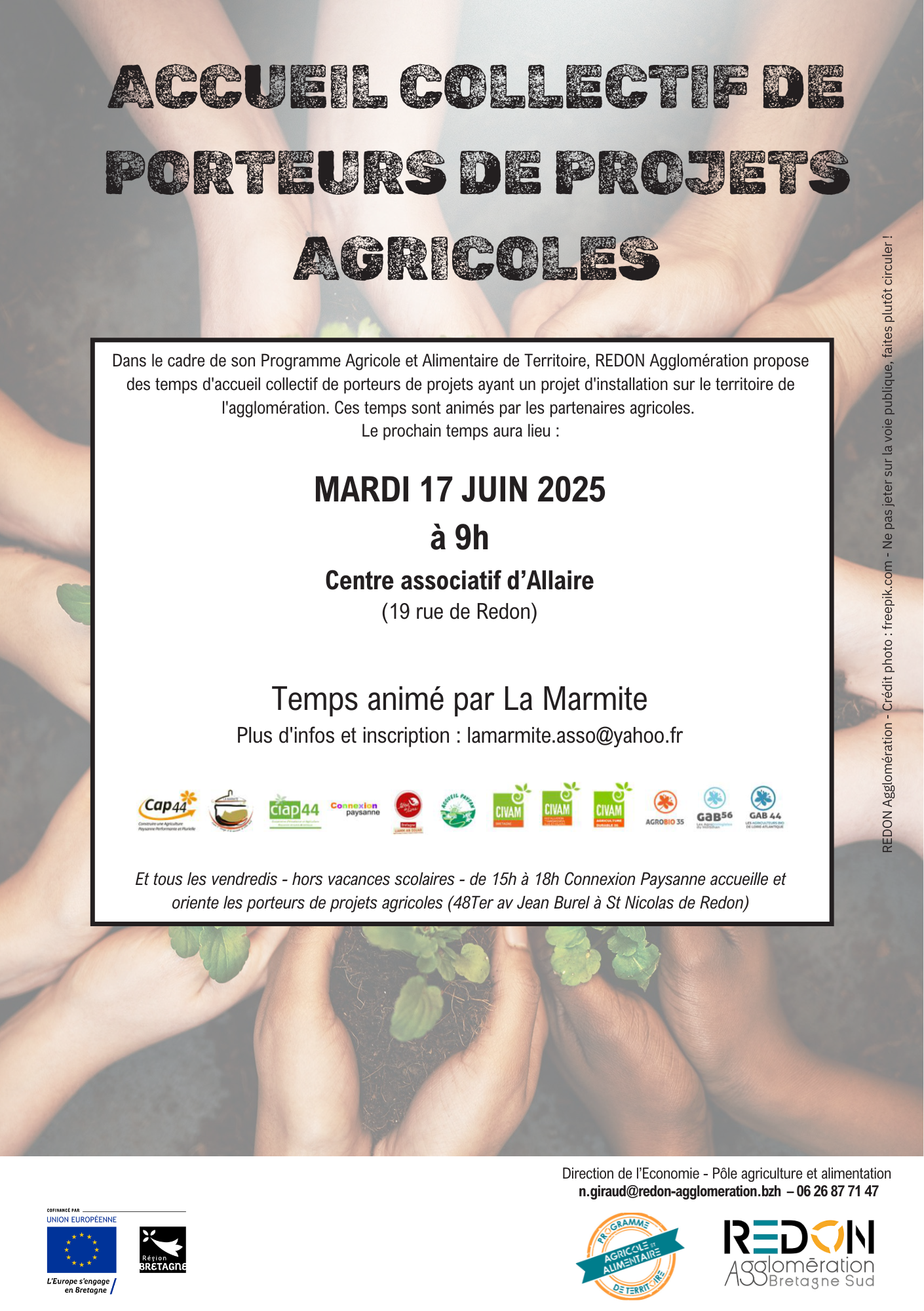 Dans le cadre du Programme Agricole et Alimentaire du Territoire de REDON Agglomération, un nouveau temps d’accueil collectif des porteurs de projets agricoles souhaitant s’installer sur le territoire de l’agglomération est organisé :