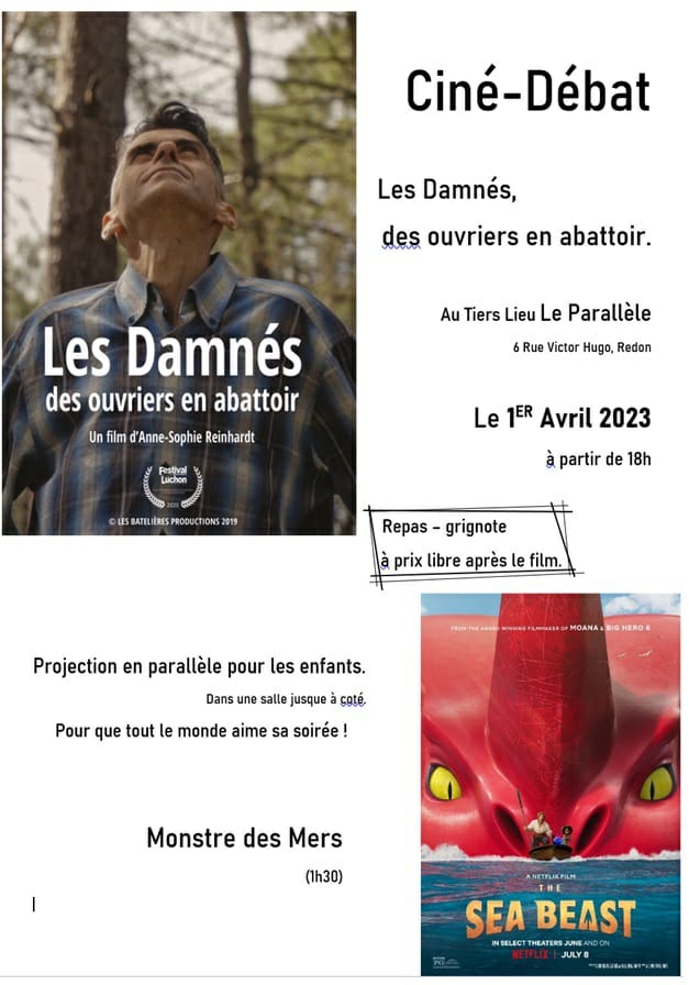 Le 1er Avril 2023, à 18H vous etes les bienvenu.e.s au Tiers-Lieu "Le Parallèle" à Redon (6 rue Victor Hugo) pour un ciné-débat autour du film "Les Damnés, des ouvriers en abbatoir".