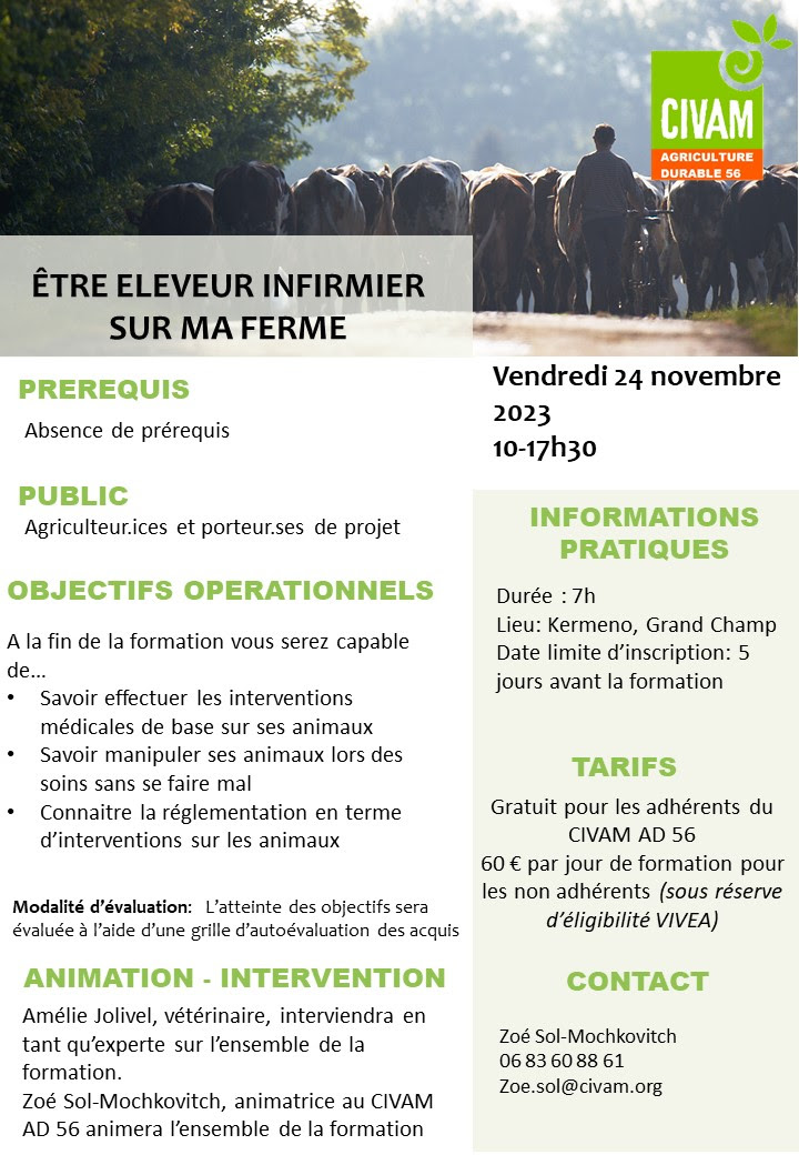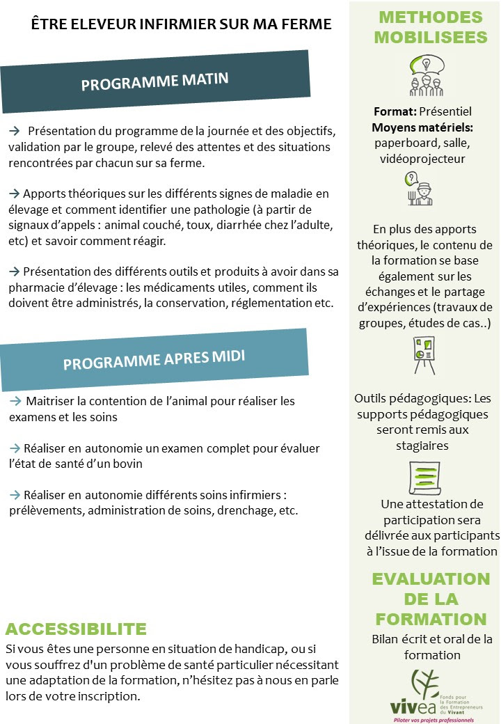 Cette journée traitera des soins pour les bovins. Si vous êtes intéressé.e par une journée pour les ovins, vous pouvez tout de même vous inscrire en le précisant dans la case "remarques/attentes". La même formation orientée ovins sera proposée début 2024 si plusieurs personnes sont intéressées