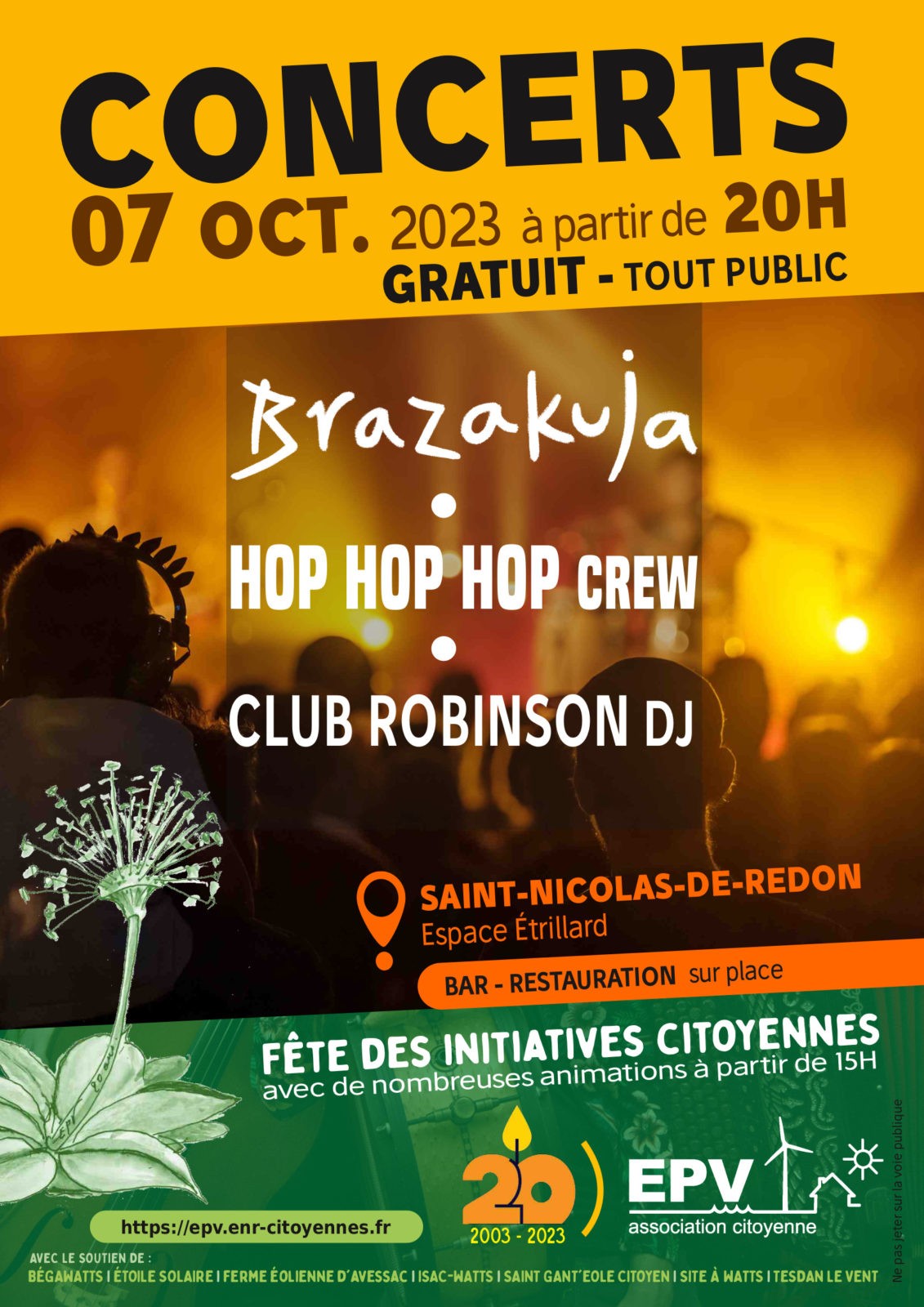 à partir de 20h, 3 concerts gratuits et tout public, BRAZAKUJA, HOP HOP HOP CREW, CLUB ROBINSON DJ