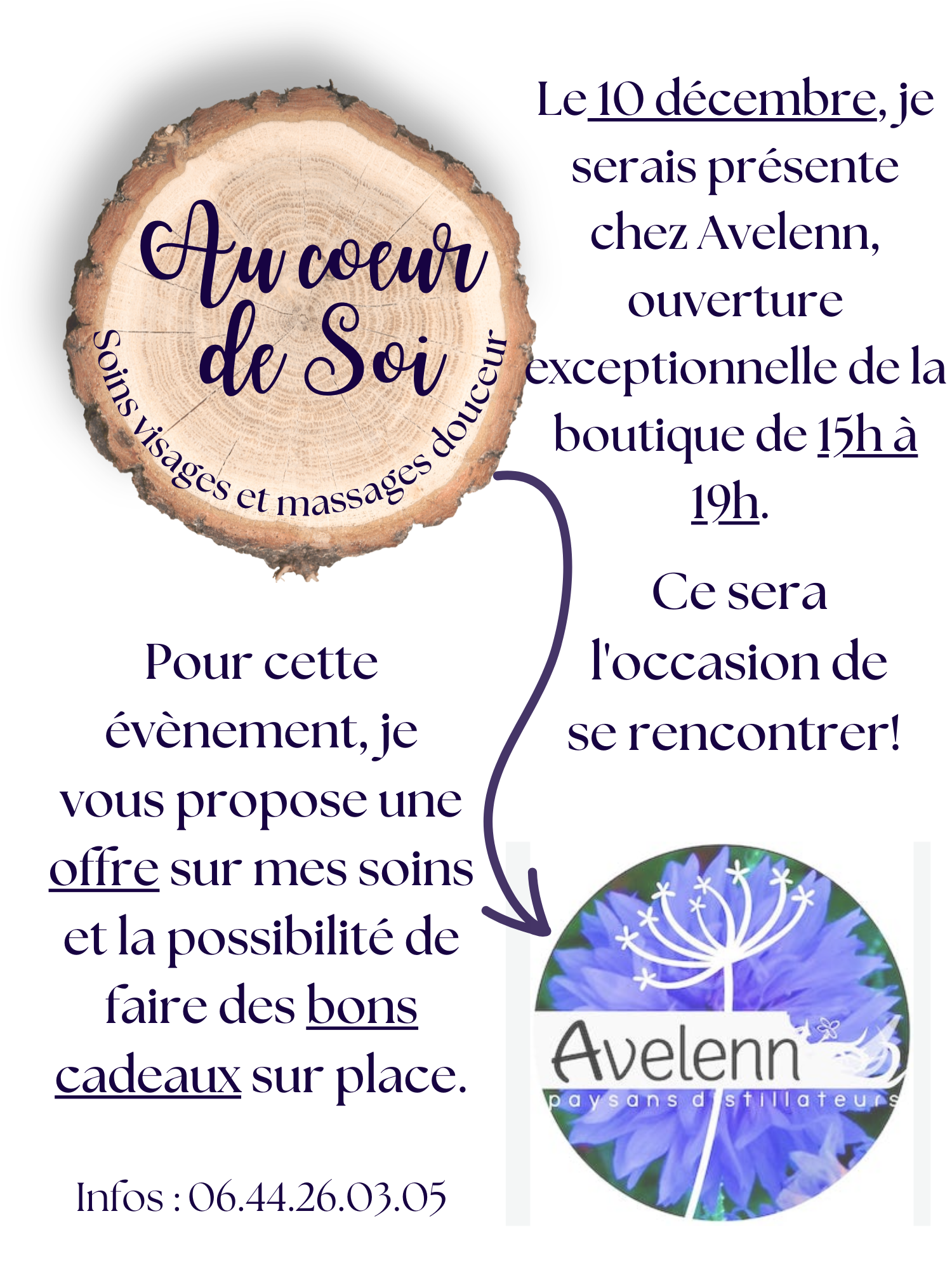 Le 10 décembre de 15h à 19h, je serai présente pour vous présenter mes soins (massages détente, soins du visage...) lors de l’ouverture exceptionnelle de la boutique d’Avelenn. Ce sera l’occasion de bénéficier d’une offre sur mes soins, et d’offrir des bons cadeaux.