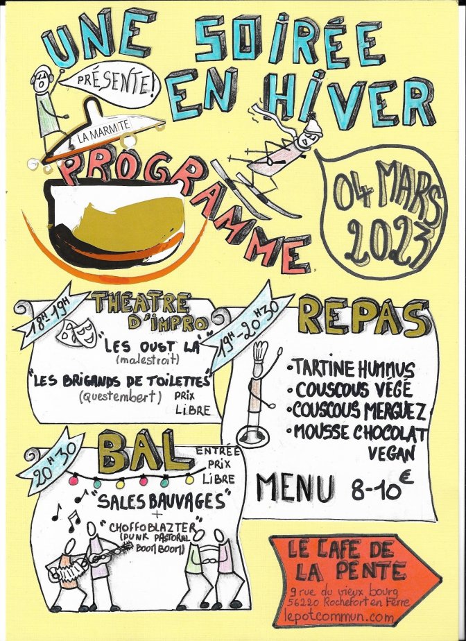 Des espaces de discussions, des jeux, parfois des concerts ou des spectacles et une TOMBOLA, dans l’optique de faire un peu des sousous de façon conviviale et solidaire pour financer les actions de La Marmite…